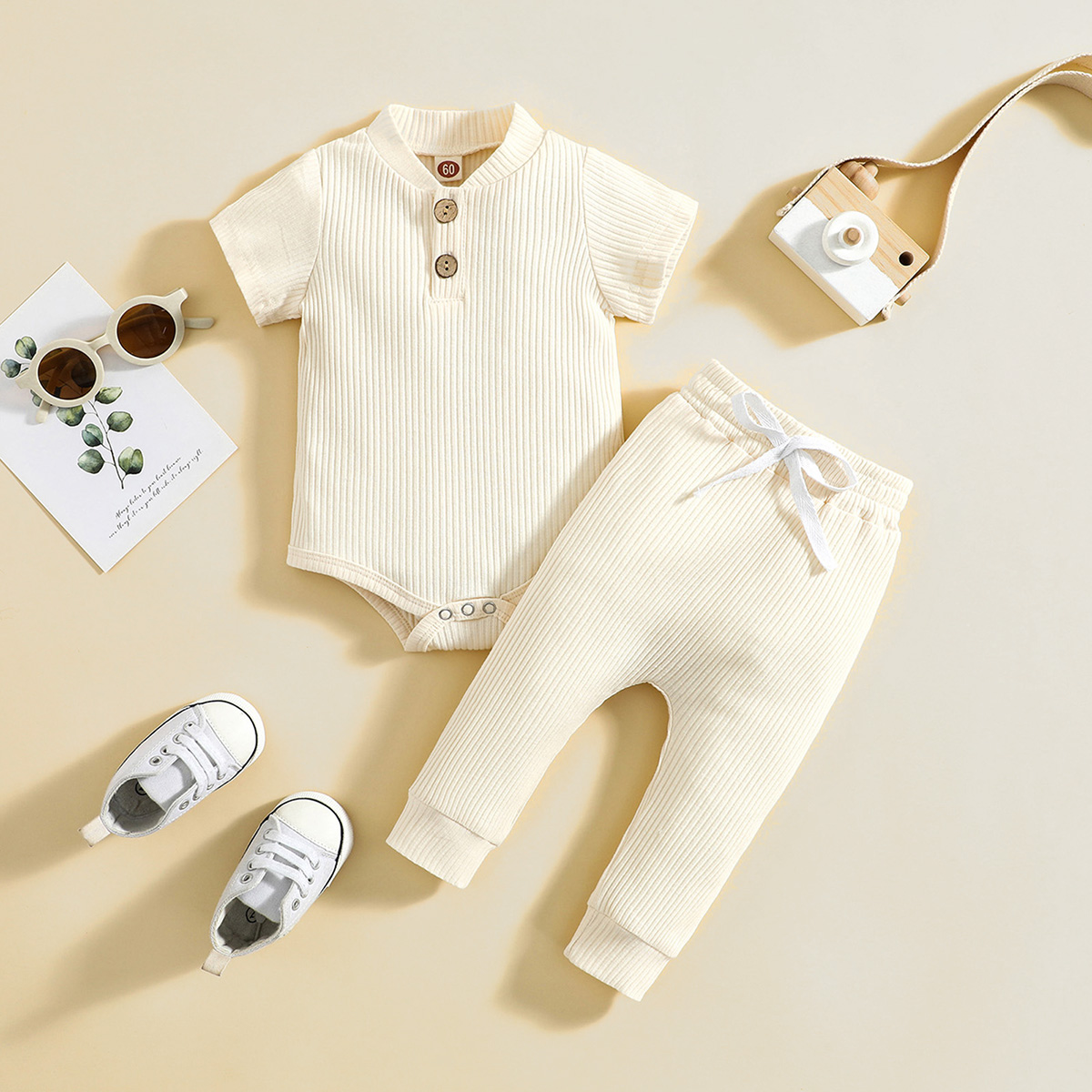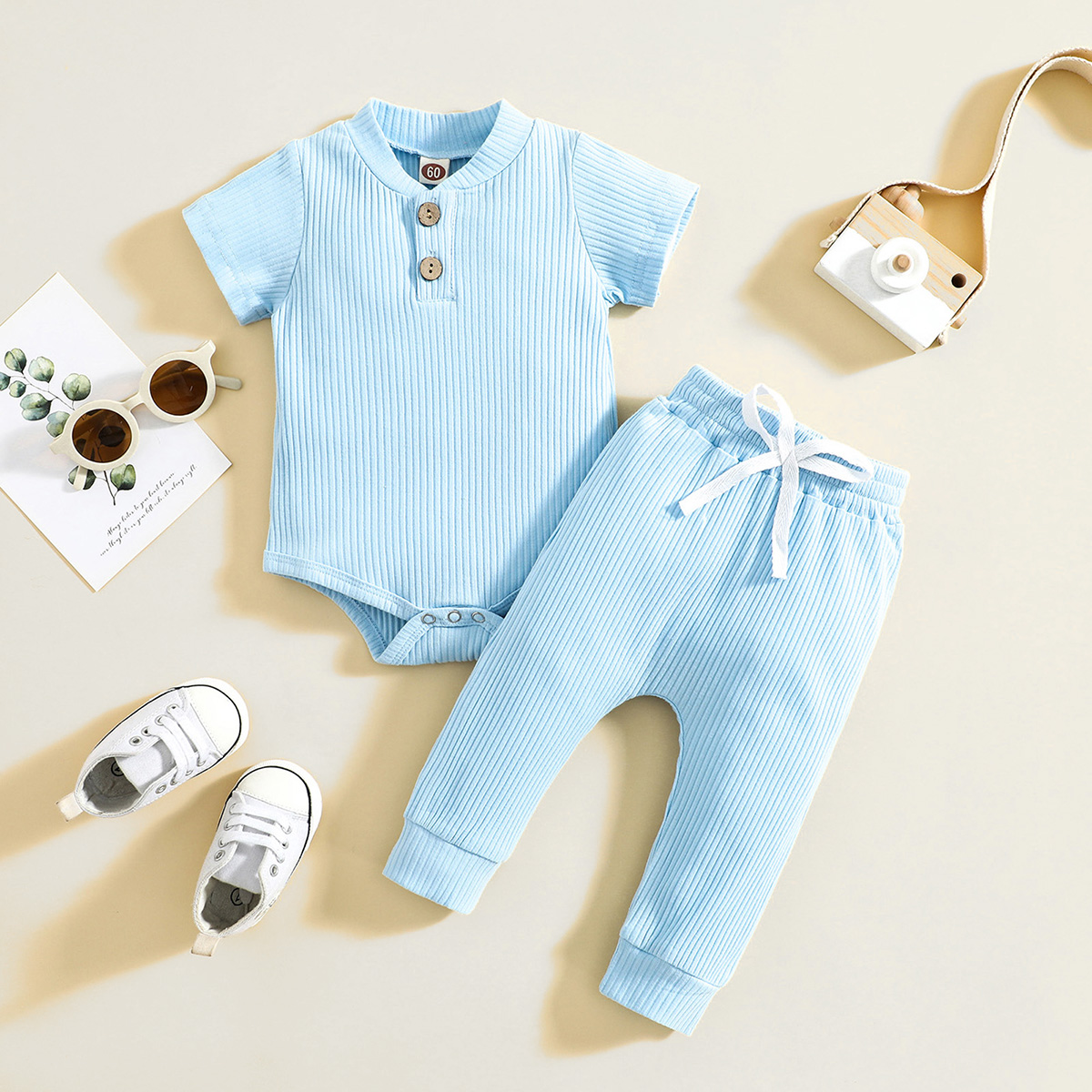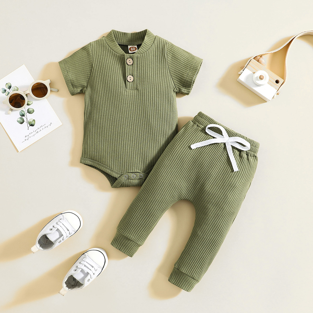 Baby 2 Pieces Solid Color Round neck Short-sleeve Bodysuit & Pants Wholesale