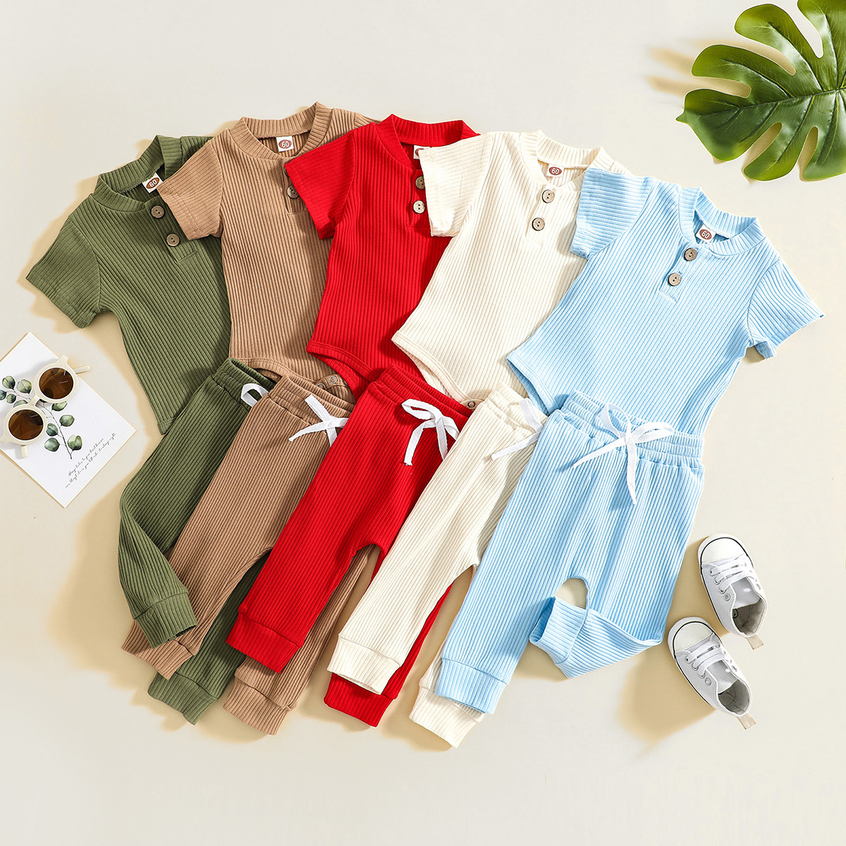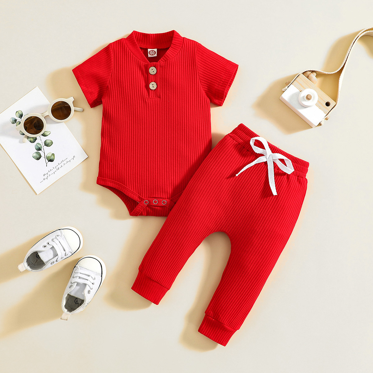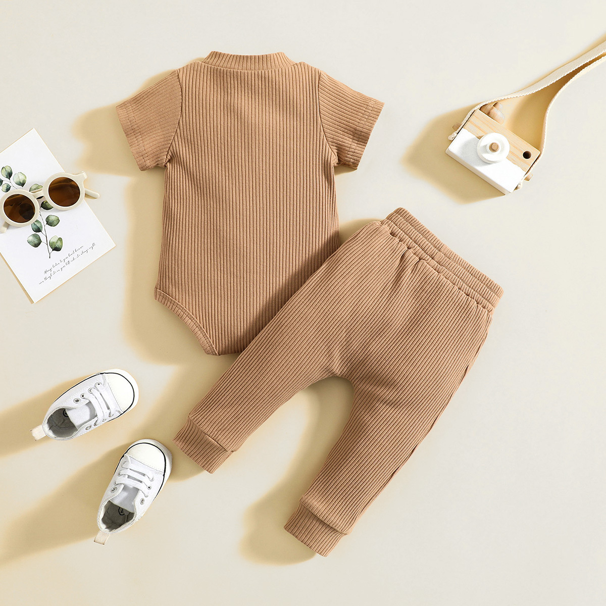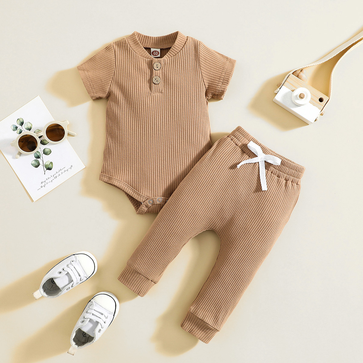 Baby 2 Pieces Solid Color Round neck Short-sleeve Bodysuit & Pants Wholesale
