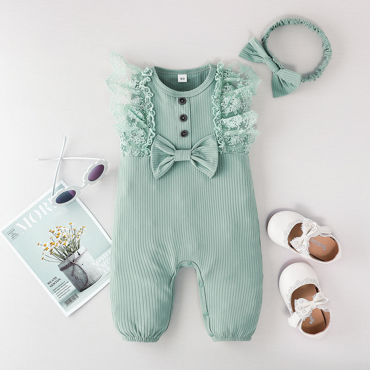 Baby Girl Beautiful Ruffle Lace Solid Colour Jumpsuit with Headband Wholesale