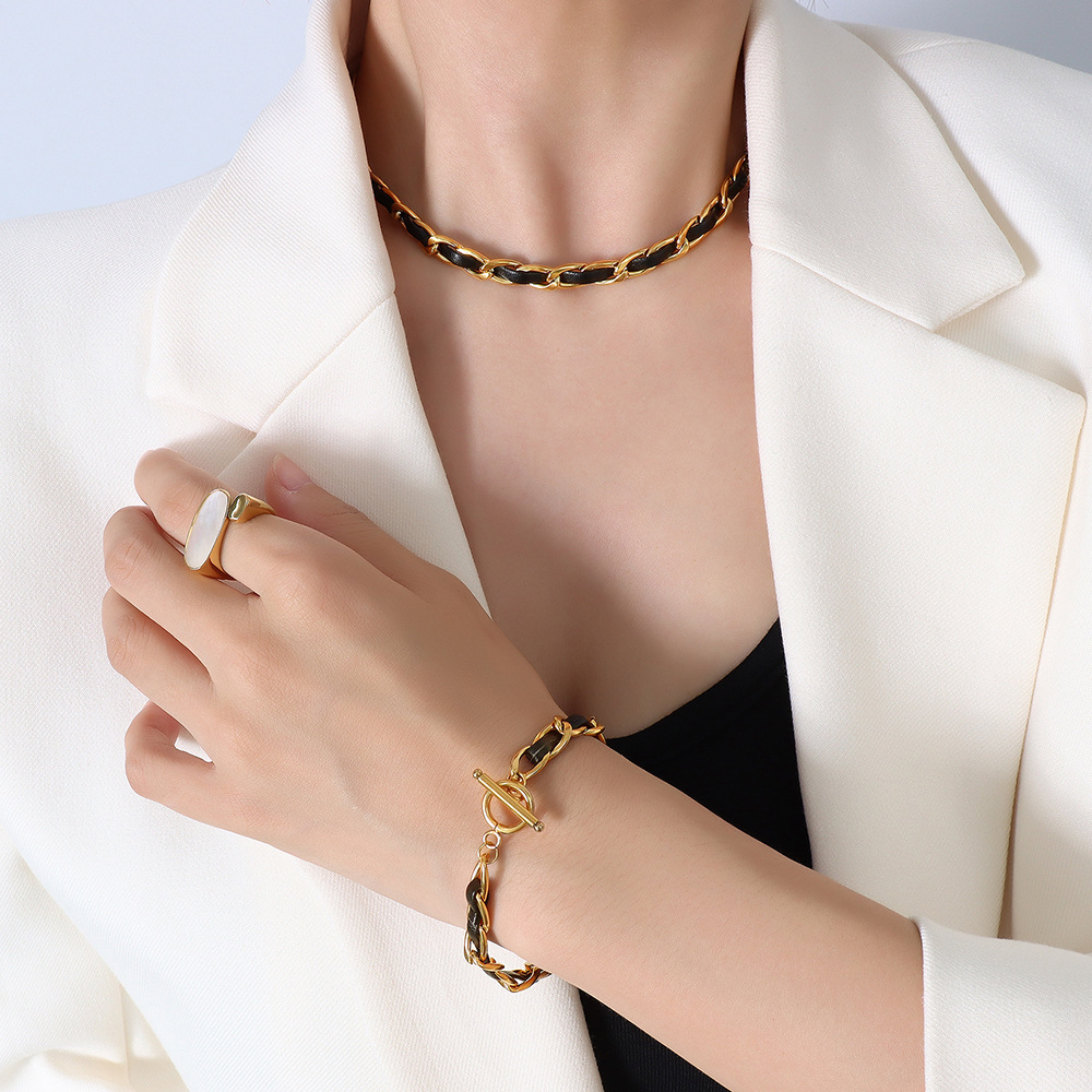OT Buckle Leather Cord Gold Chain Necklace & Bracelet Set