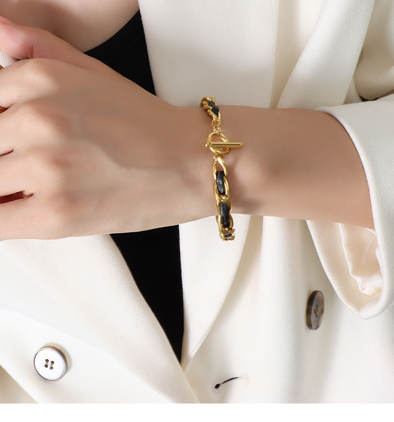 OT Buckle Leather Cord Gold Chain Necklace & Bracelet Set