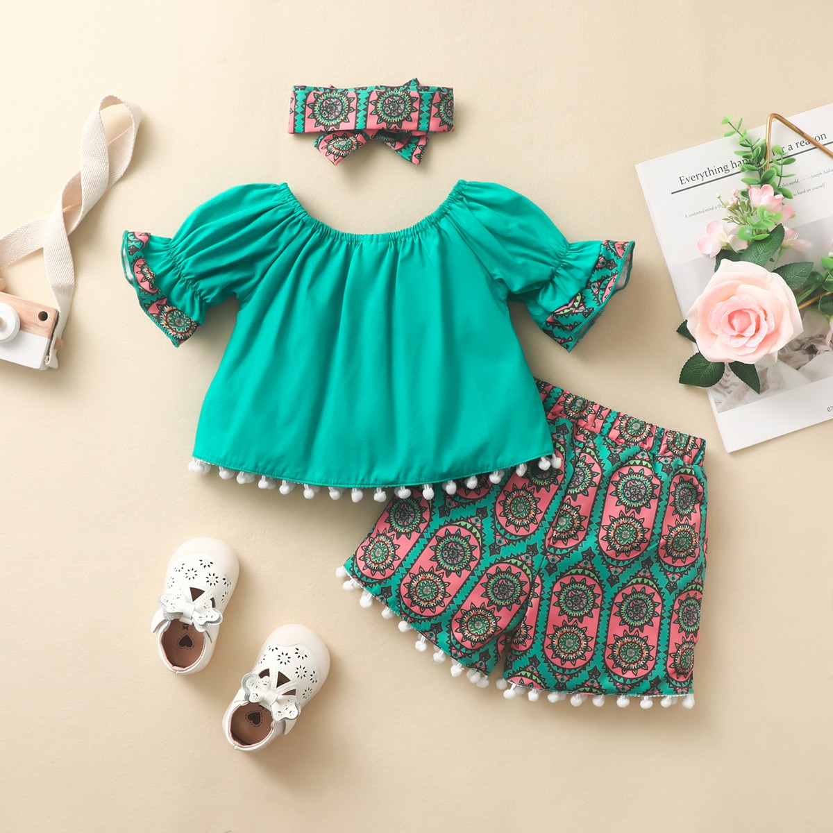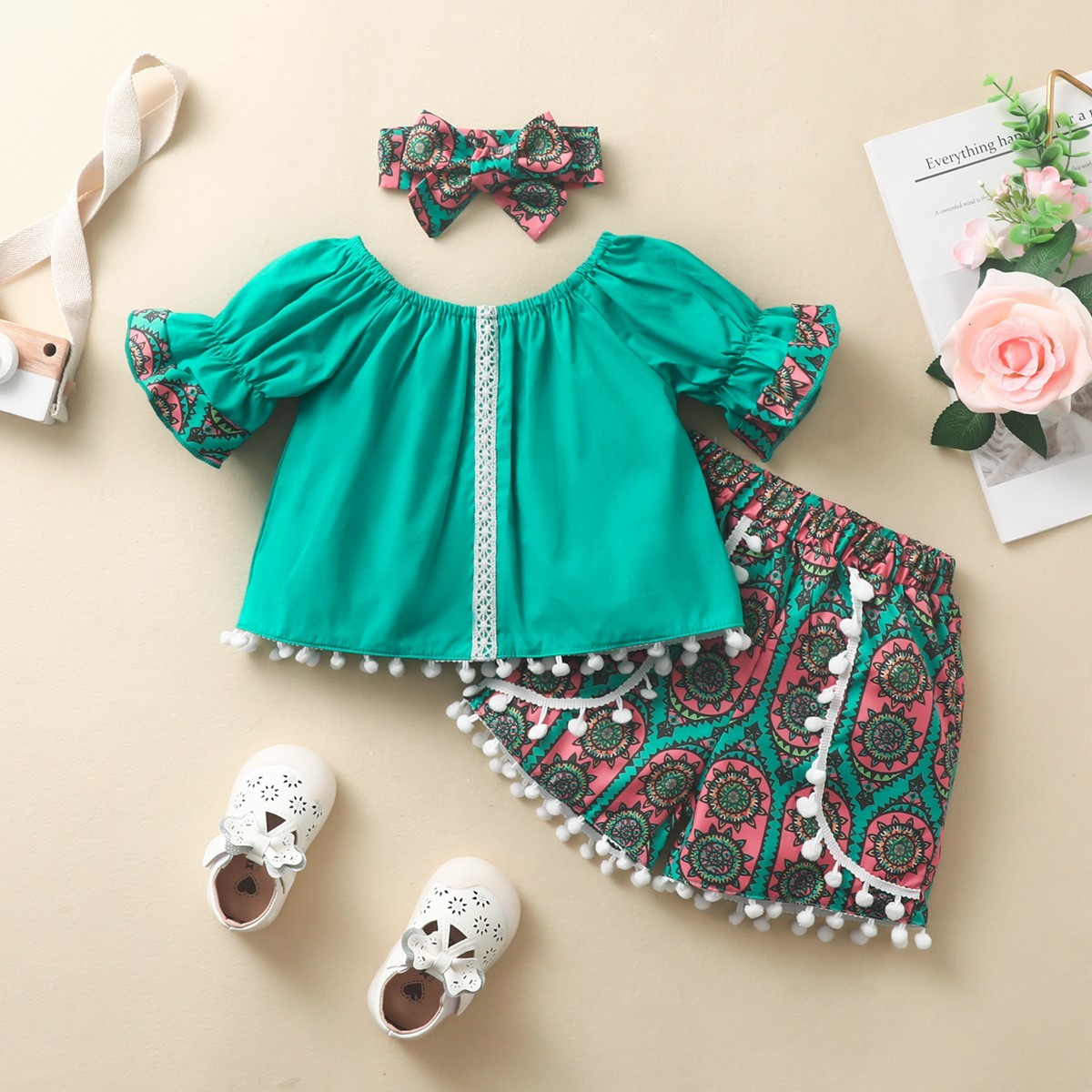 Baby Girl Tassels Solid Colour Top And Boho Shorts with Headband Wholesale