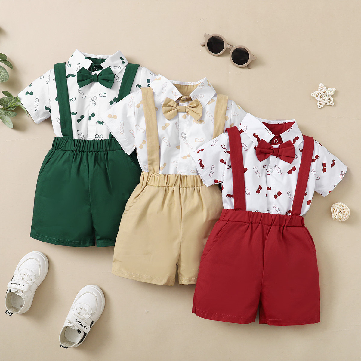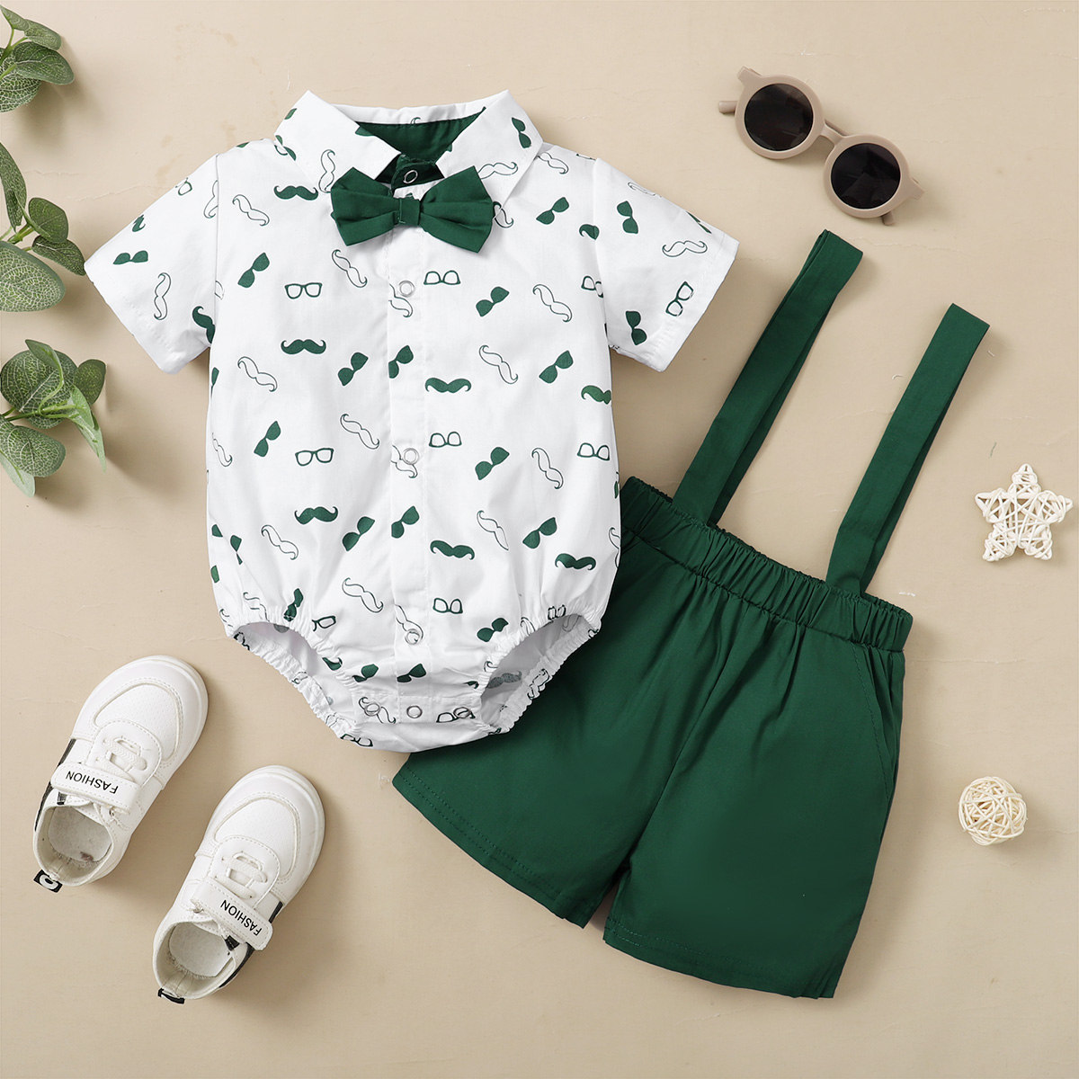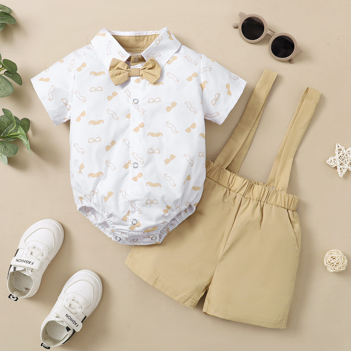 Baby Boy Gentleman Mustache Sunglasses Pattern Bow-knot Decoration Bodysuit & Suspender Shorts Wholesale