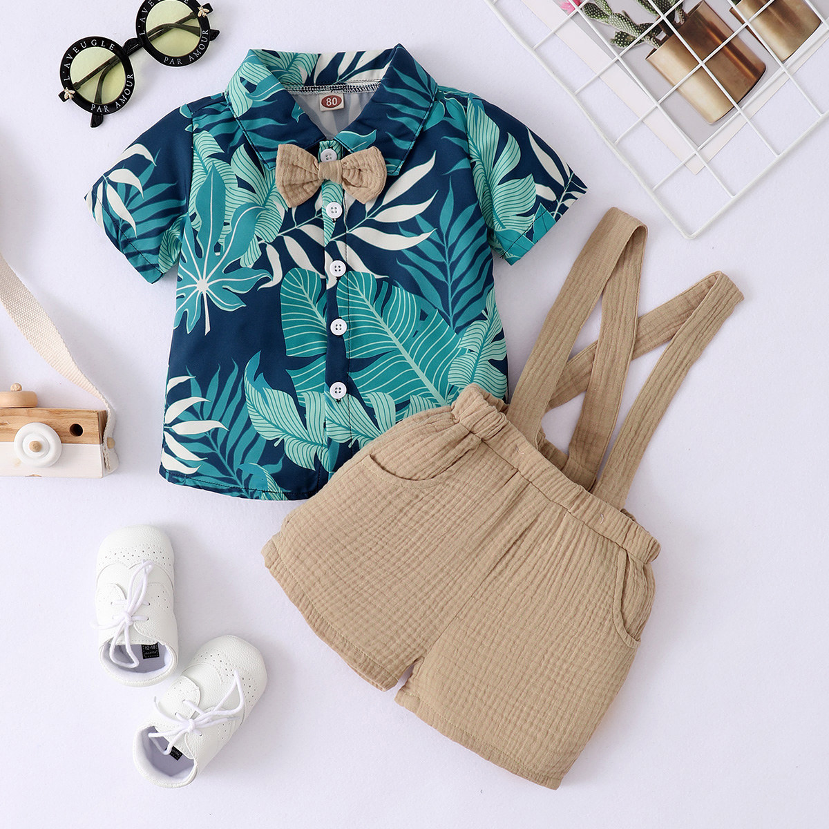 Baby Boy Gentleman Tropical Pattern Bow-knot Shirt & Suspender Shorts Wholesale