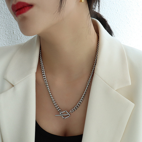 A statement set that has some features. OT buckle structure makes it pretty easy to put on and take off. The chunky chain outlook presents a hardcore rocky style. Spice up your daily outfit!